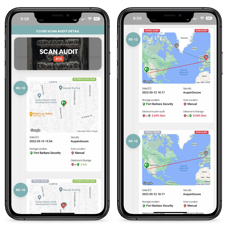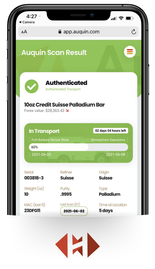 A sequence of steps provides real-time authentication and relevant precious metal details such as the serial number, weight, photographic references, estimated value, the Auquin integrity score, and more.